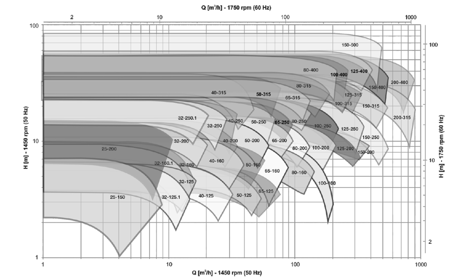 Bomba normalizada bajo ISO 2858, mono etapa, de succión simple horizontal y descarga vertical. Construcción “Back-pull-out”, que permite mantenimiento sin necesidad de desacoplar las tuberías. Diseño hidráulico según ISO 9906 anexo A. Fabricada en hierro fundido, acero inoxidable, acero dúplex o bronce, con sellado mecánico o prensaestopa, caja de rodamientos lubricados con aceite o auto lubricados. Tamaños desde 25mm hasta 200 mm. Utilizada para agua limpia hasta temperatura de 70ºC (temperaturas superiores, consultar opciones). Caudal Max: 1060 m³/h – Caudal Mín: 10 m³/h; Presión Máxima: 120 mca – Presión Mínima: 8,0mca.