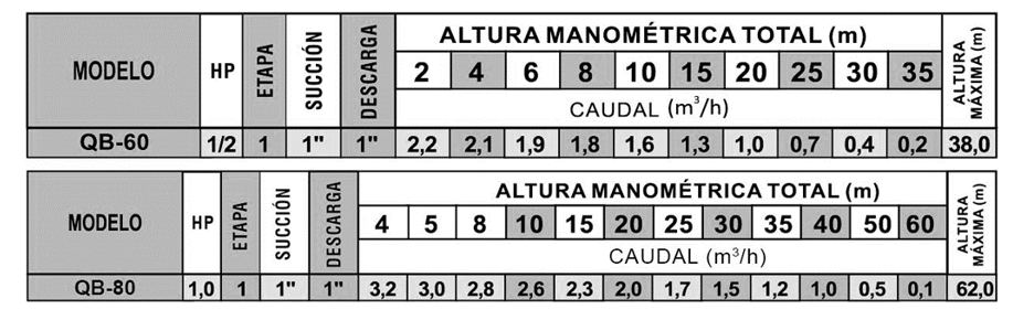 Bombas Periféricas prácticas, compactas y fáciles de transportar. Equipos monoetapa con motor monofásico proyectado para mejor disipación del calor (a través del diseño de aletas), capacitor permanente y protector térmico, IP-44 con potencia de ½ Hp y 1 Hp, doble voltaje 110-220V, 60Hz, 3500rpm, conexiones roscadas NPT, Succión 1″ x Salida 1″. Utilizada para agua limpia. Caudal Máximo: 2,3m³/h – Caudal Mínimo: 0,2m³/h; Presión Máxima: 38,0mca – Presión Mínima: 2,0mca.