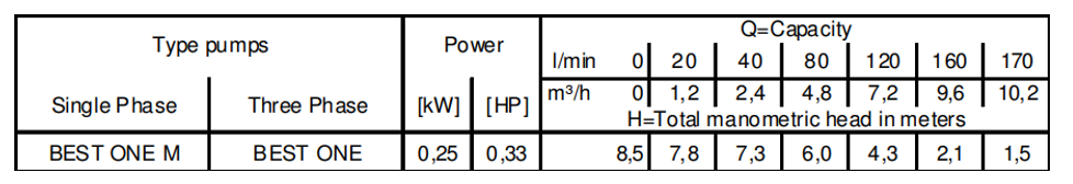 | Altura manométrica | De 1,8 a 8,3 m para BEST ONE |