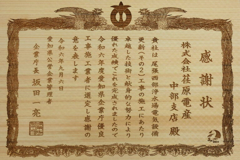 『尾張西部浄水場電気設備更新(その2)工事』で愛知県企業庁優良工事表彰を受賞しました。