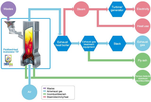 The fluidized-bed incineration systems take advantage of the thermal capacity of hot fluid sand to quickly and uniformly combust the materials to be treated. Therefore, the systems are able to treat a wide range of waste, including municipal solid waste, low calorific value waste like waste liquids and sludges, and high -calorific value waste like shreddeddiscarded tires or waste plastics. It is also suitable for mixed firing using the refuse dug up from final disposal sites, night soil sludgeexcreta or sewage sludge.