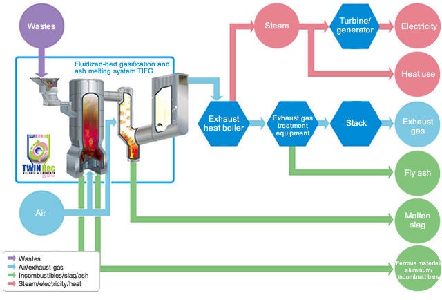 It is equipped with the TIF® incineration system's internally swirlingcirculating feature. Recovering iron, aluminum and other substances in an unoxidized state, it helps reduce the volume of waste disposed of indisposed in landfills.