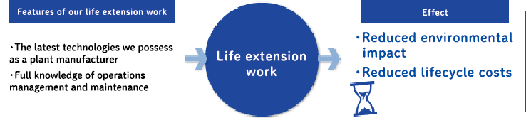 We renovate facilities that have been operating for nearly 20 years to extend their service life. We have been involved in many service life-prolonging projects that have enabled facilities to achieve new performance specifications, including the replacement of equipment with equipment that is more energy-efficient and better at power generation, which also contributes to reducing CO2 emissions. We also use our technological strengths developed throughout our history as a plant manufacturer and our knowledge of equipment and devices that has been accumulated through our management of operations and maintenance services to implement basic facility improvements without disrupting the daily operations of facilities.