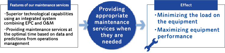 We are involved in all facility processes, including design, construction, operations and maintenance. We leverage the broad technical knowledge of our design staff to provide maintenance services. We are able to carry out maintenance at the right timing in the right method on the basis of signs detected and the data collected through the monitoring of day-to-day operations management.