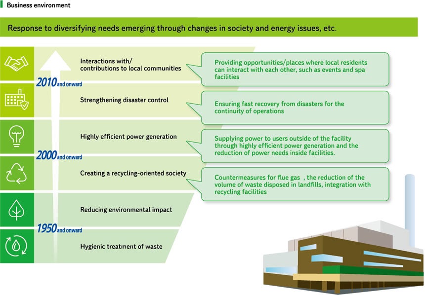 Shifting from an era in which facilities simply incinerated waste, the social needs for the functions of waste treatment facilities has been diversifying to acting as local energy centers through waste power generation while being disaster response base and places for communications among local residents. We will respond to wide-ranging needs.