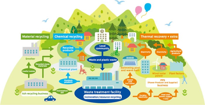 Social needs for waste treatment facilities have been diversifying. In the past, they merely burned waste to hygienically treat it. Today, they are local energy centers generating energy from waste, disaster response bases and places for communications among local residents. In addition to properly treating the waste created by local communities to ensure hygienic living environments for everyone, they recover the heat emitted from waste incineration to generate electricity. The ash generated from incineration is fully recycled into recycled building materials as construction material and valuable metals including gold are recovered. We provide systems like this that enable the circulation of resources for the local utilization of waste and energy to help build a sustainable society.