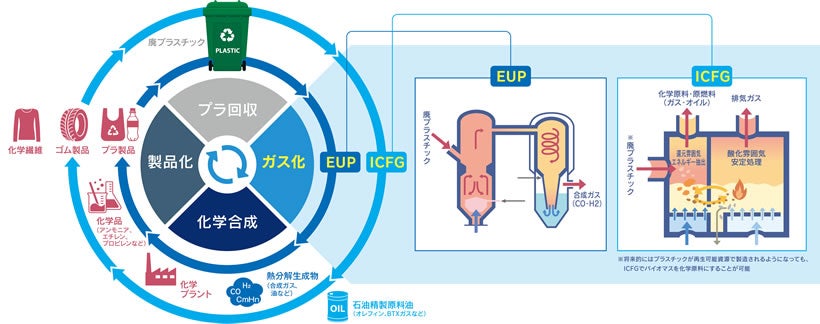 廃プラスチックのガス化ケミカルリサイクルは、他の手法ではリサイクルが困難な異種素材や不純物を含むプラスチックを分子レベルに分解し、様々な科学物質に再生することが可能であり、リサイクル率の大幅な向上と化石資源の使用量抑制に貢献します。