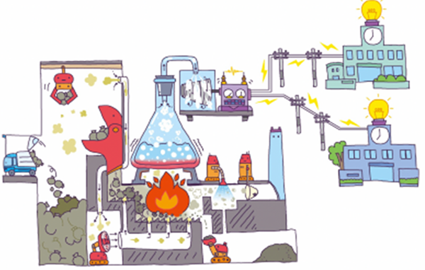 ごみ焼却施設はごみを燃やす際に出る熱を利用して蒸気を沸かし、その蒸気の力でタービンを回して電気を生み出すことができます。つまり、地域から出たごみから電気を生み出し、その電気を地域内で消費するといった「電力の地産地消」が可能となったのです。従来通り電力会社の送電線を使って電気の供給を受けるので、物理的な電力供給の仕組みに変更はなく、電気の品質や信頼性はかわりません。