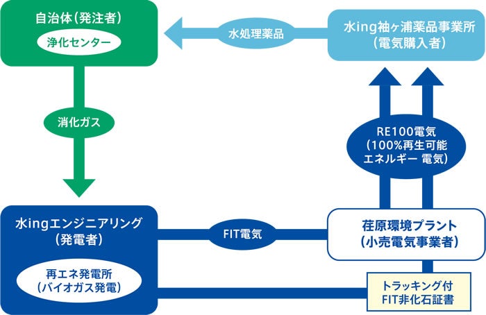水ing株式会社袖ケ浦薬品事業所様向けに、水ing様が自らの再エネ発電事業で発電したFIT電気にトラッキング付非化石証書を組み合わせたRE100電気として供給しています。