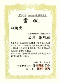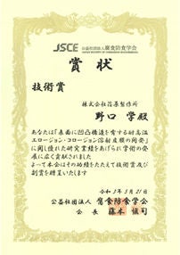 荏原環境プラント(社長:渡邉 良夫、本社:東京都大田区、以下:当社)の石川 栄司と、荏原製作所の野口 学ら※1は、この度、公益財団法人腐食防食学会(以下:腐食防食学会)の2021年度技術賞を受賞しました。腐食防食学会は材料全般の腐食防食の研究や技術の促進・普及を目指す国内唯一の機関で、技術賞は、腐食防食分野における技術開発や啓蒙に広く貢献した技術に対して贈られるものです。
