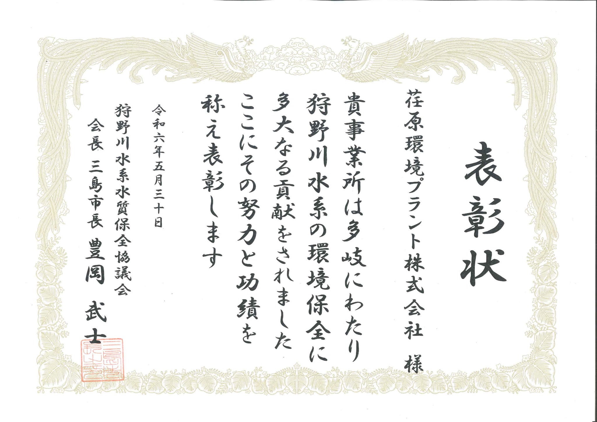 荏原環境プラント株式会社(社長:山田 秀喜、本社:東京都大田区、以下、当社)は、5月30日に静岡県三島市で行われた「第59回狩野川水系水質保全協議会総会」にて「令和6年度河川美化功労者賞」を受賞しました。