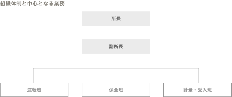 所長、副所長、保全班、計量・受入班などは、朝出勤し、夕方退勤します。職場によっては早番、遅番や交替での土日出勤などもあります。 - 交替勤務