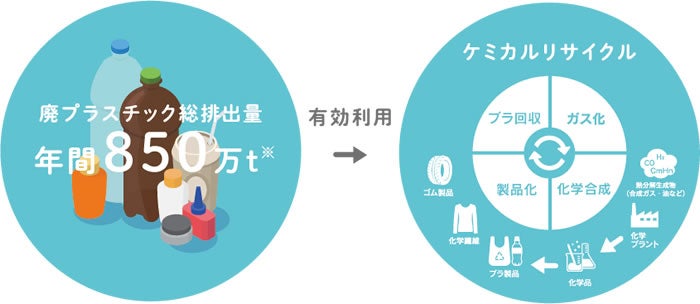 廃プラスチックのガス化ケミカルリサイクルは、他の手法ではリサイクルが困難な異種素材や不純物を含むプラスチックを分子レベルに分解し、様々な科学物質に再生することが可能であり、リサイクル率の大幅な向上と化石資源の使用量抑制に貢献します。