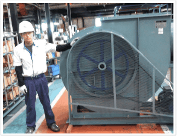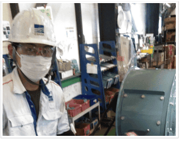 送風機の小型機種では10人構成の組立ラインで一人一人各工程を担当しており、私はベルトを張る直結作業を行っています。