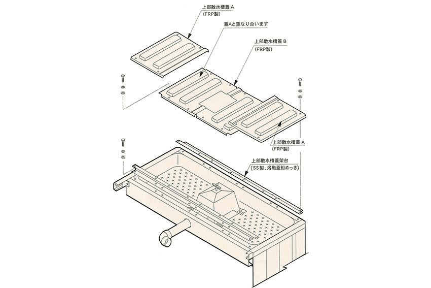 上部散水槽への異物の飛来や侵入を防ぎ、藻の発生の原因となる日光をさえぎります。蓋の上を歩行できます。