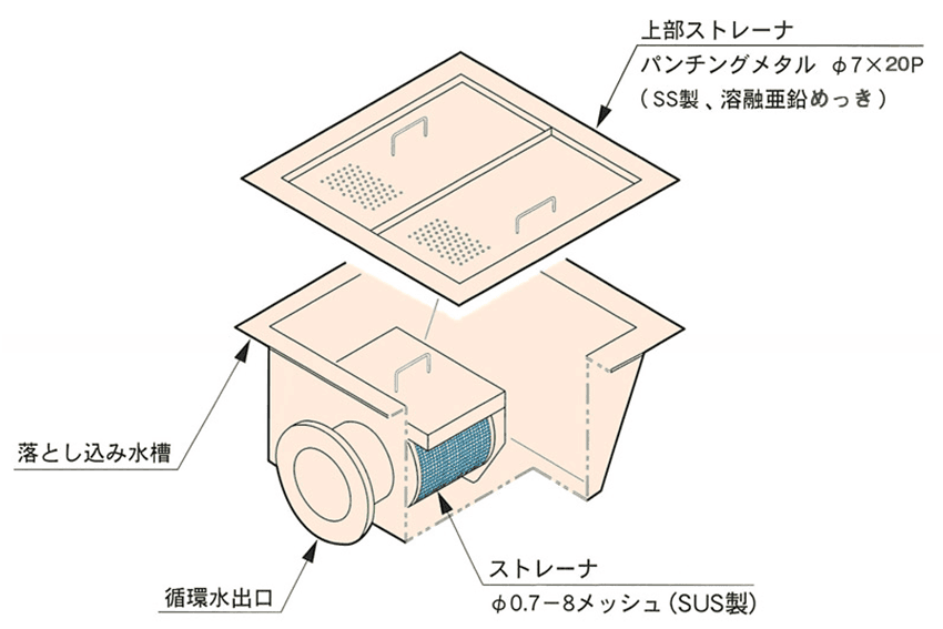 冷却水に混入している小さな(3mm目)異物まで捕集する必要がある場合に有効なオプションです。 (本図はSDC-U150、SDW-U100、SPC-U125、SPW-U90以上の機種を示します。)