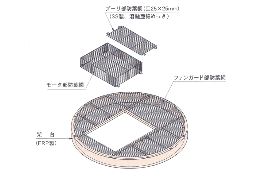 冷却塔内部への、木の葉や鳥の飛来、侵入、巣造りを防ぎます。表記の網目であれば、吸込部・吐出部の 両方を取り付けた場合でも、性能は満足します。