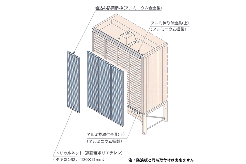 冷却塔内部への、木の葉や鳥の飛来、侵入、巣造りを防ぎます。表記の網目であれば、吸込部・吐出部の 両方を取り付けた場合でも、性能は満足します。