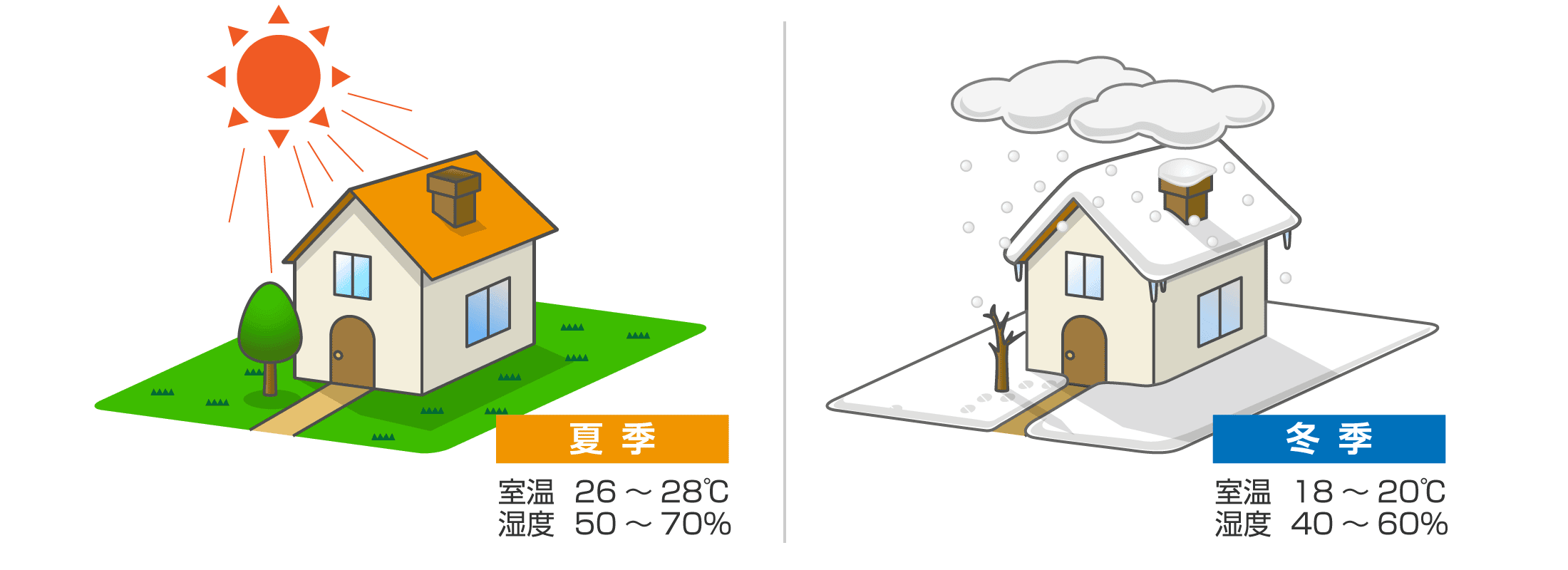 快適な空調条件とは人それぞれの好みにもよりますが、夏と冬ではそれぞれ目安とする室温、湿度が異なります。