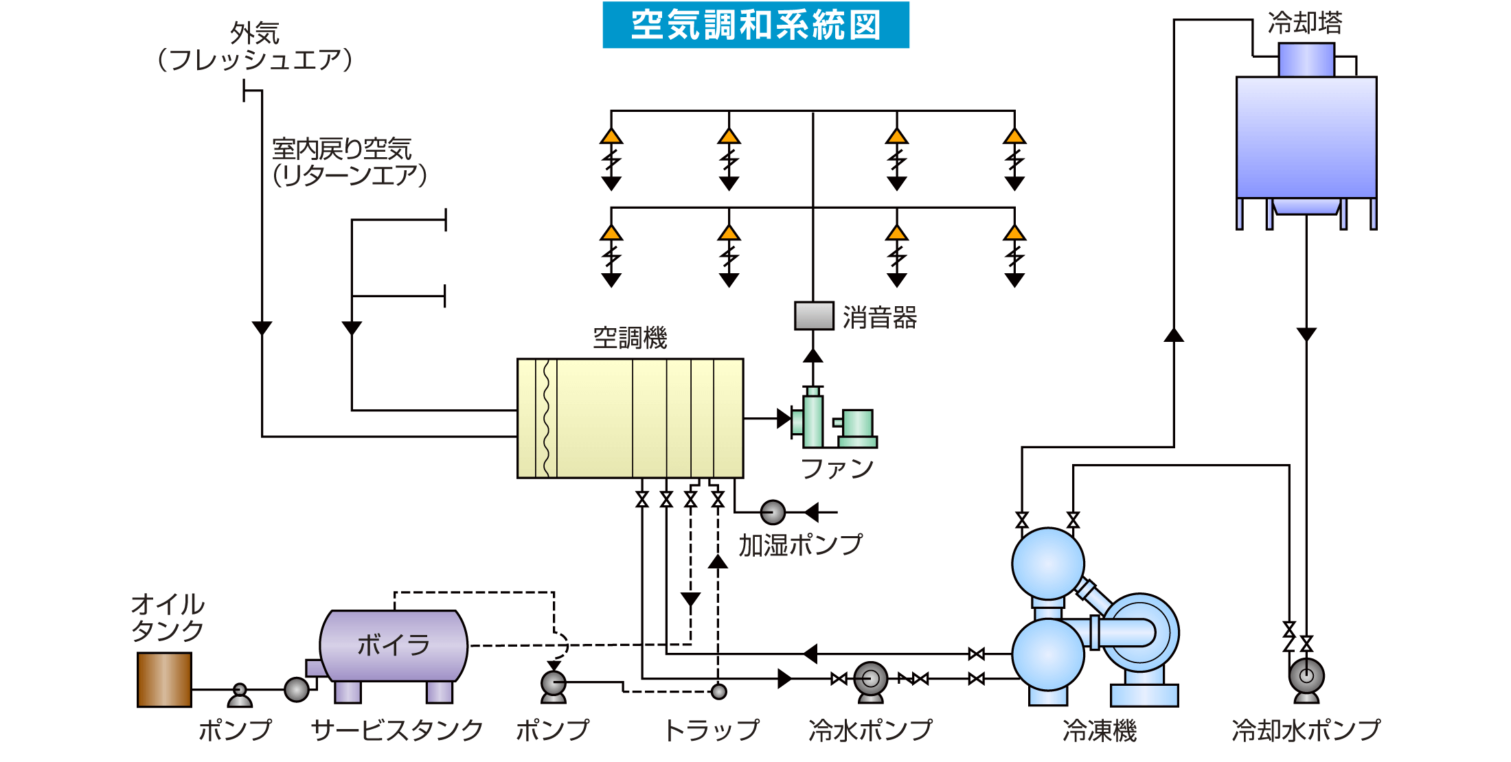 当社製品にもある大型のターボ冷凍機や吸収冷温水機などを使用して集中的に"冷たい水"や"温かい水"を大量に作り、専用の空気調和装置へ連続的に供給することで空調を実現する方式を「セントラル空調システム」と言います。