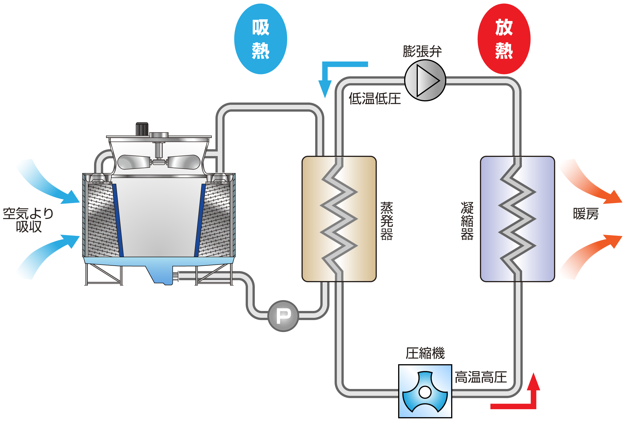 冷却塔をヒートポンプ用途として使用する場合、重油や灯油・ガスなどの燃料を使わずに、空気や地下水・河川水などの自然エネルギーを利用して冷暖房兼用が可能で、安全かつ衛生的でコストも節約できます。都市で使える自然エネルギーとしては主に熱源として空気が選択されます。 冷却塔はこの空気熱源ヒートポンプシステムの吸熱部に使用することができます。