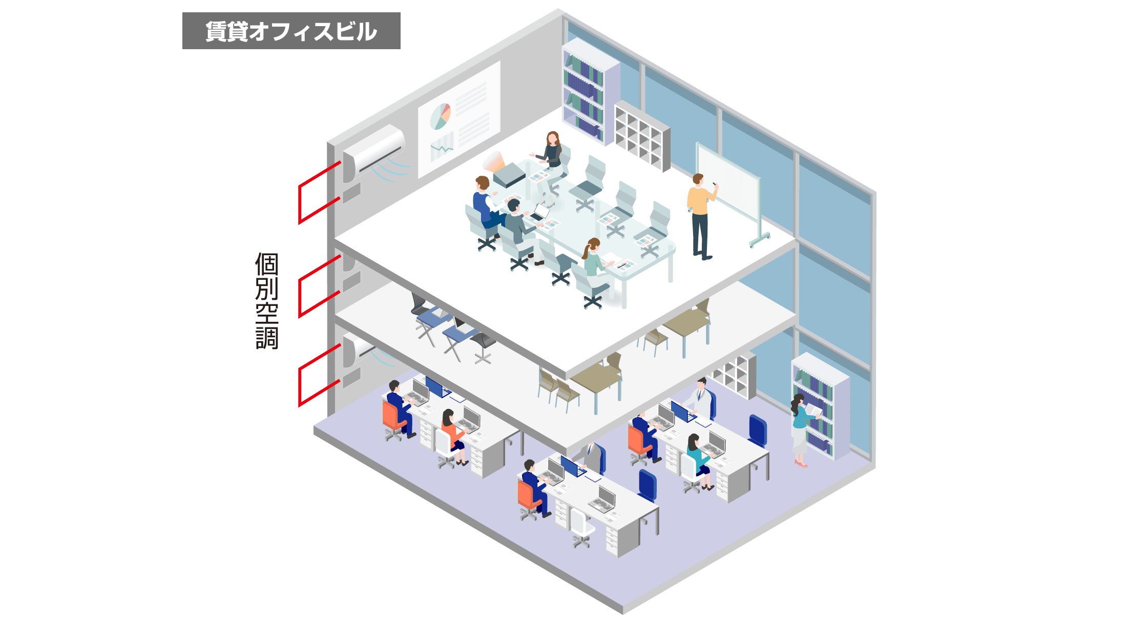 複数の企業が入っているオフィスビルの場合は、各オフィス(企業)によって建物の使用時間帯が異なる為、冷暖房機を1ヶ所でコントロールしにくく、各階又は使用室毎に1台ずつの機械を設置し、使わない時に止めるという方式がよくとられます。