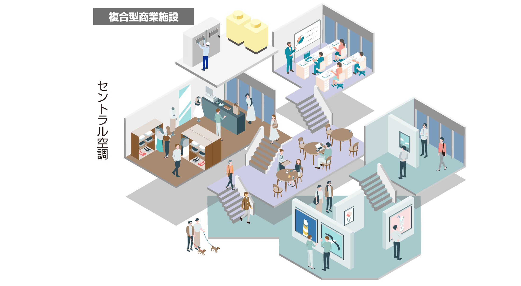 これに対し、建物の稼働時間として始業・終業がほぼ同じ複合型商業施設などの場合には、どこか1ヶ所に機械をまとめて管理する方式が主に採用されます。