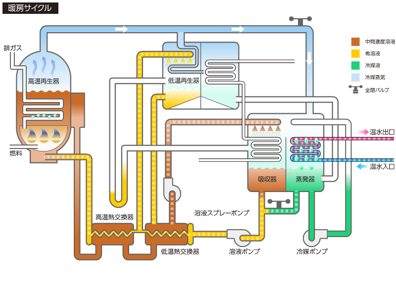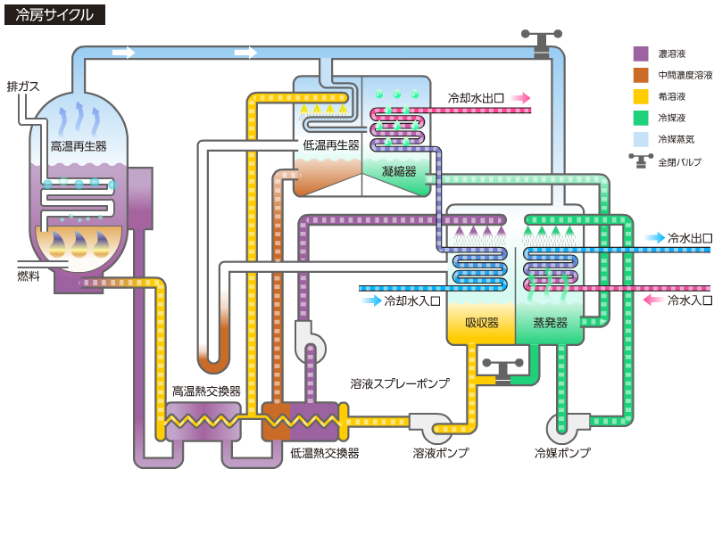 冷媒は蒸発器内で蒸発し、冷水を冷やします。蒸発した冷媒は吸収器内の濃溶液に吸収されます。 冷媒を吸収して薄くなった溶液(希釈液)は溶液ポンプにより熱交換器を経て高温再生器と低温再生器に導かれます。この希溶液は高温再生器内ではバーナにより加熱され濃溶液となります。低温再生器では高温再生器で発生した冷媒蒸気により加熱され中間濃度溶液となります。高温熱交換機を経た濃溶液と中間濃度溶液は合流し低温熱交換器を経て吸収器に入り蒸発器で蒸発した冷媒蒸気を吸収します。 低温再生器で発生した冷媒は、凝縮器で冷却水により冷却・凝縮され蒸発器にもどります。