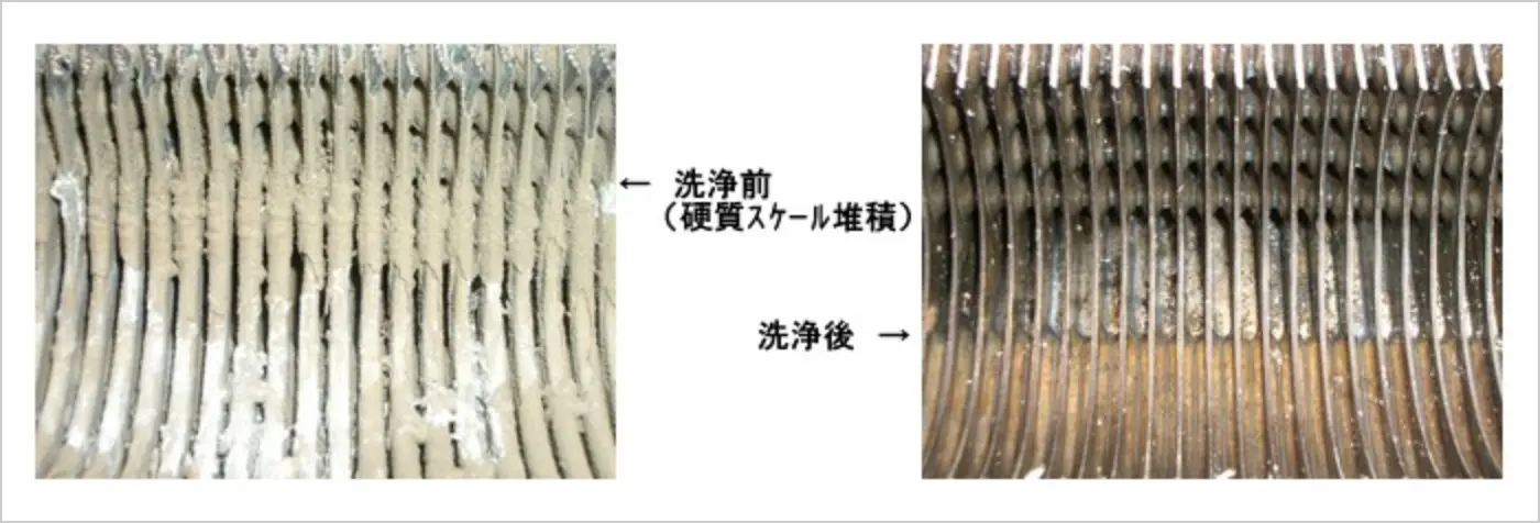 熱交換器内への汚れの付着は、冷水・冷却水に対する伝熱低下の原因となり、エネルギーロスの多い非効率な運転状態になります。熱交換器の電熱効率低下が確認された場合には、随時状況にあった洗浄方法をご提案しますので、お客様の省エネ管理にお役立てください。