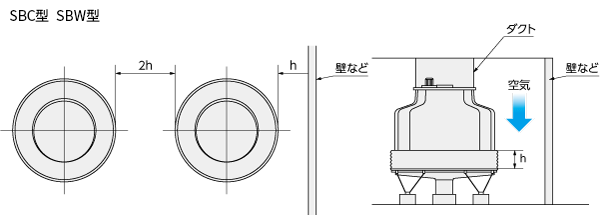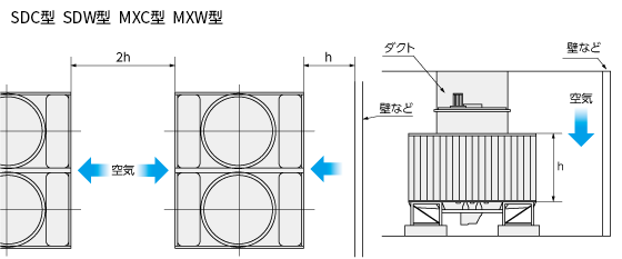 - 周囲の壁などにより、冷却塔からの吐出空気が流入空気に巻き込まれ、冷却塔内で再循環しない場所に設置願います。