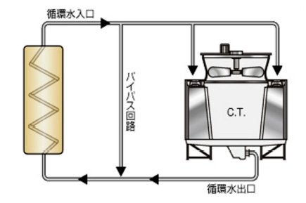 循環水の入口配管と出口配管の間を連通するバイパス回路を設け、冷却塔への水量を制御する方式です。