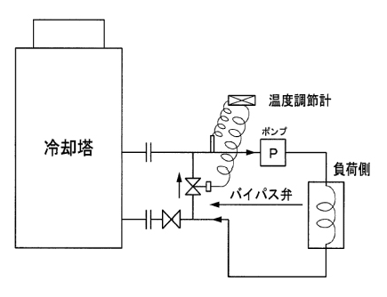 制御(負荷調整)方法としては、冷却塔の循環水入口・出口配管系統をつなぐバイパス弁または三方弁を設け、冷却塔よりの出口水温を検知し、温度調節計によりバイパス弁または三方弁を作動し、負荷側の循環水入口温度を調整します。負荷が少なすぎる場合は、冷却塔への循環水が閉止しないような処置が必要となります。また、負荷が少なすぎて循環水や散布水の凍結が予想される場合にはファンの運転制御を併用する必要があります。