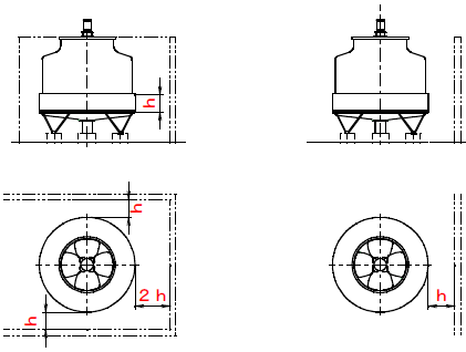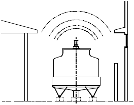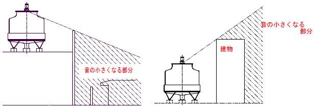冷却塔は通常屋外に設置されるので、騒音が直接周囲に影響を及ぼす場合があります。その場所が市街地・住宅地にある場合、たとえ小型であっても周囲に及ぼす影響が大きい場合もあるので設置にあたっては検討が必要であり設置場所の設定においては次のことに注意して下さい。