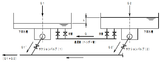 Q1<Q1', Q2<Q2'(Q1' - Q1 = Q2 -Q2' = Q)の場合、水量Q分を連通管により戻す必要があります。(下部水槽の許容水位差hと必要連通量から配管径を決定します。)