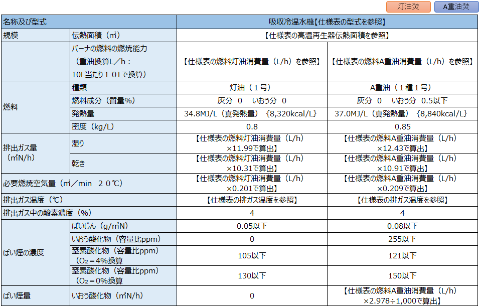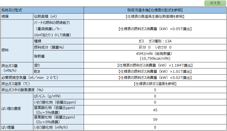 注1)仕様表の燃料ガス消費量(kW)は、燃料ガス高位発熱量(MJ/m3)(NTP)× 燃料ガス流量(m3/h)(NTP)÷3.6 で計算しています。
