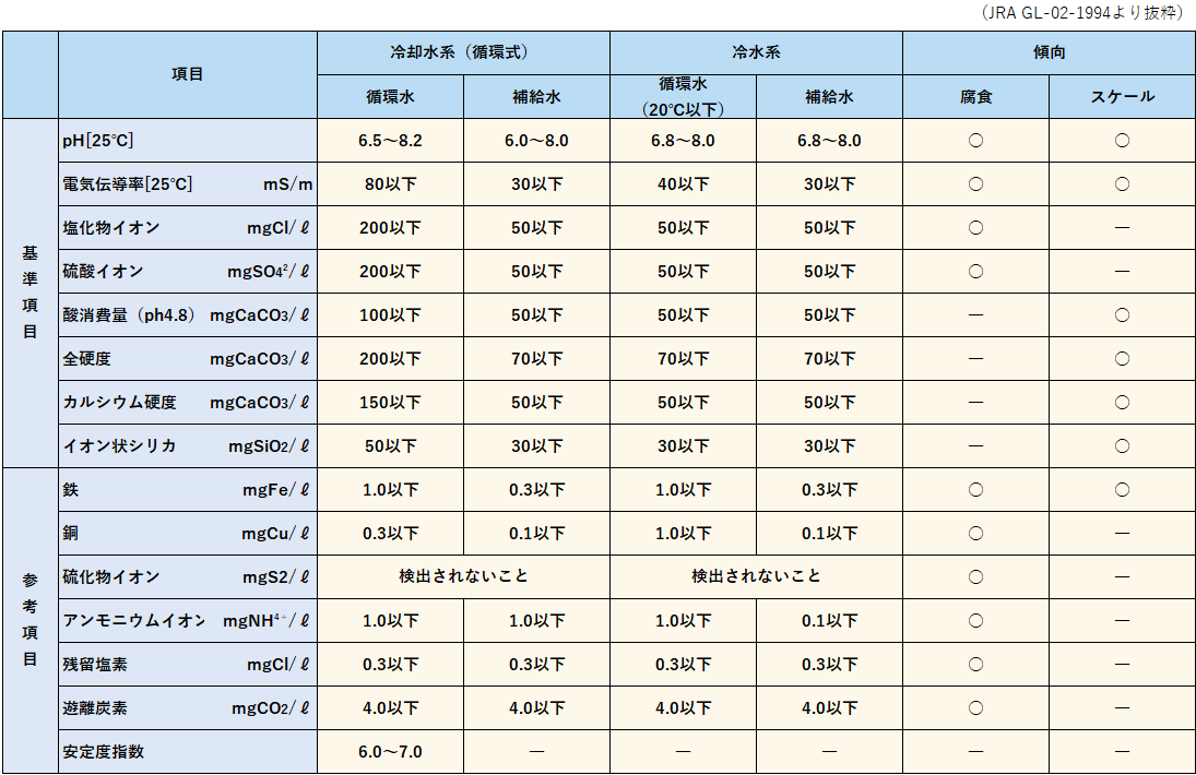 下表は、日本冷凍空調工業会が制定している「冷凍空調機器用水質ガイドライン(基準値)」です。