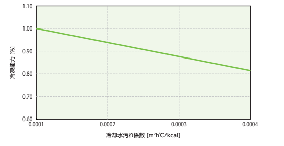 汚れ係数は流体の種類・性質や温度により変化し、汚れ係数が大きいほど冷凍機の効率及び能力が低下します。