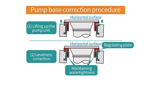 In areas with weak ground or when uneven settlement occurs due to an earthquake, the pump must be returned to its horizontal position to prevent failures such as bearing damage. With conventional vertical pumps, it was necessary to rebuild the pump base to keep it watertight, which was time-consuming and expensive. The flexible base pump uses a special base that allows you to easily adjust the horizontality while maintaining watertightness.