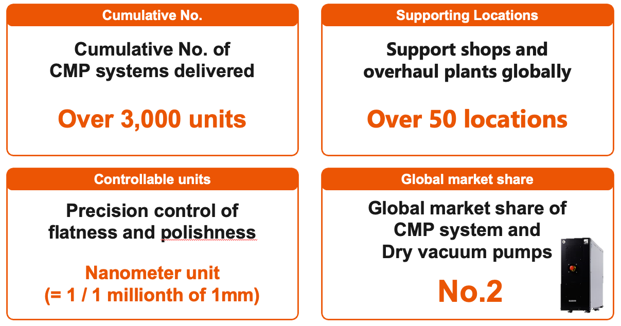 We support the realization of an ever-evolving, highly advanced information society by providing dry vacuum pumps necessary for the manufacture of semiconductors and flat panel displays, as well as CMP equipment that flattens the wafers that produce semiconductors at the nano level.