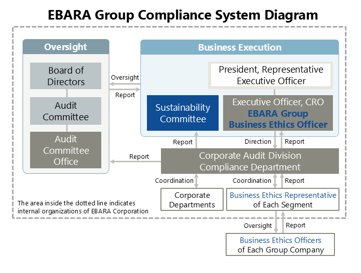 | Internal department in charge of compliance | The department in charge of compliance responds to consultations regarding violations of the EBARA Group's business ethics framework and/or laws and regulations by employees, and takes corrective action as necessary after conducting an investigation. |