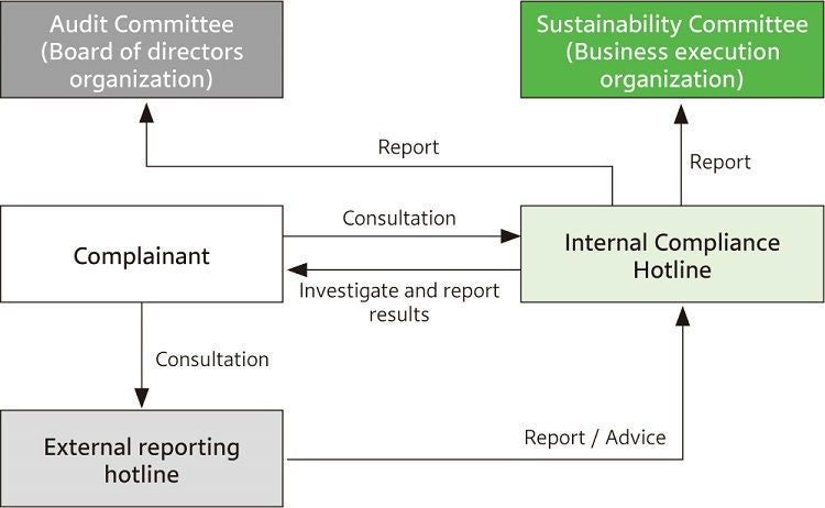 The operation status of the hotlines is reported to the Sustainability Committee, chaired by all executive officers and attended by directors. The deliberations of the Sustainability Committee are reported to the Board of Directors and appropriate oversight is conducted.
