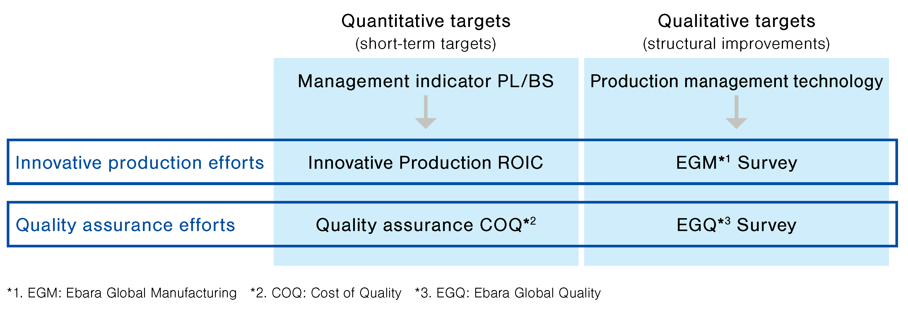 To achieve "EBARA Global Quality," we have set quantitative and qualitative targets and are working to achieve both.