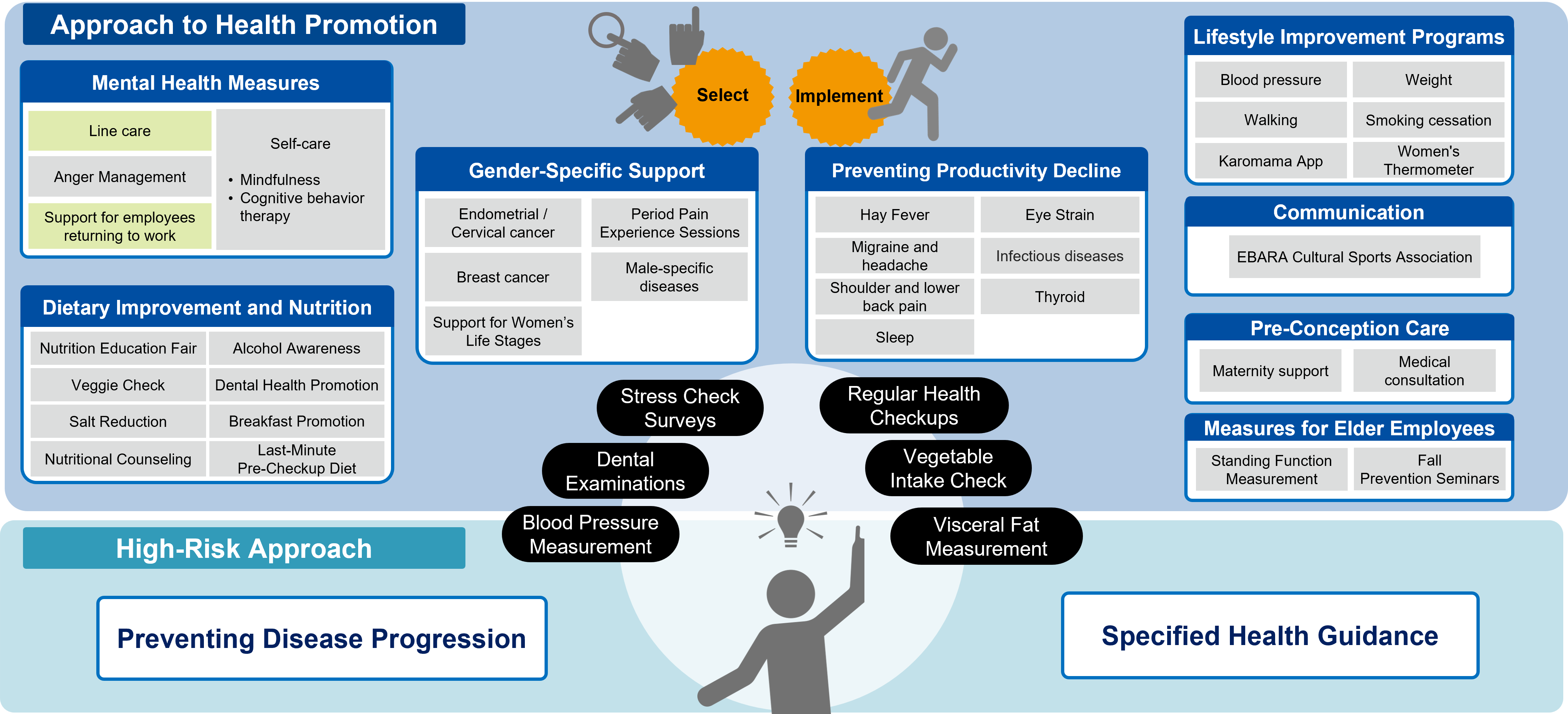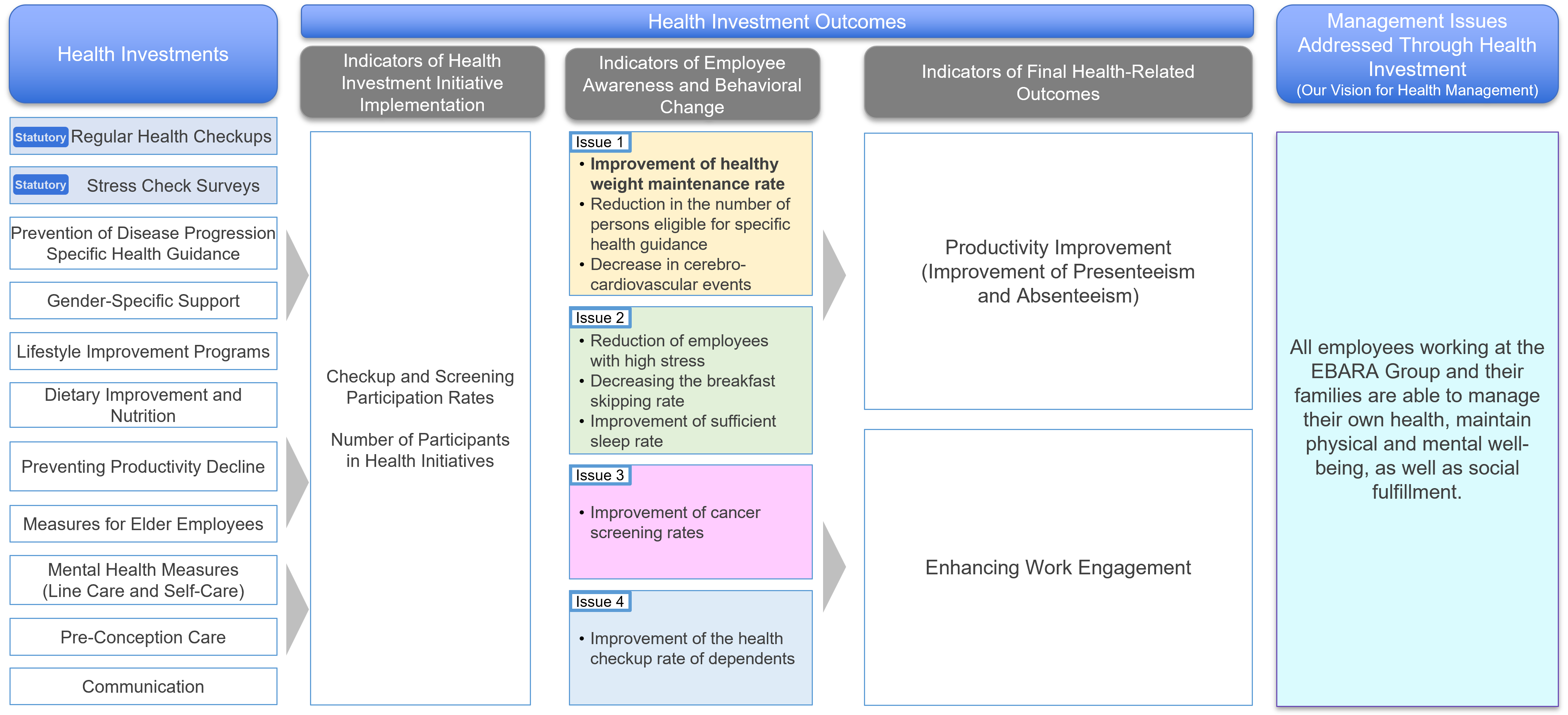 The EBARA Group visualizes the health status of employees by aggregating and analyzing health checkups, lifestyle and health insurance union medical expense information, etc.