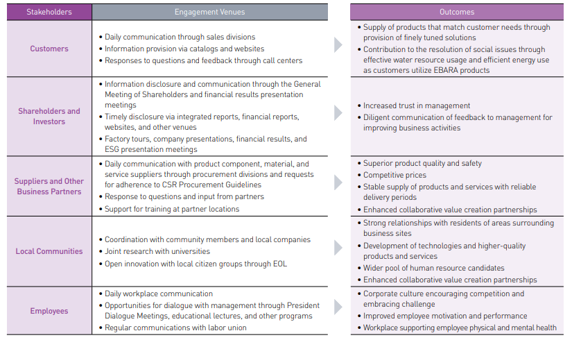 Throughout the course of our operations, we prioritize creating value through collaboration with diverse stakeholders. We believe that strong partnerships with all stakeholders is essential for the sustainable growth of the EBARA Group. We will continue to work on creating new value by collaborating with and engaging in dialogue with all stakeholders.