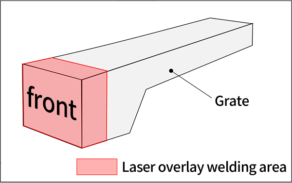 Laser overlay welding is achieved by using a laser. Because it can be done with lower heat input than other overlaying methods, it has benefits that include the base metal being less likely to deform, strong adhesion, and the overlay metal being less likely to peel off. With this project, we tried to increase the durability and extend the service life of new grates by applying laser overlay welding to the surface.