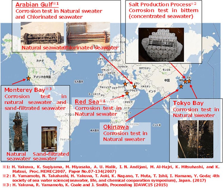 We obtain field data by investigating corrosion behavior of the materials for pumps in seawater at a wide range of salinity levels (3.5 to 35 %) and water temperatures (10 to 110 °C).