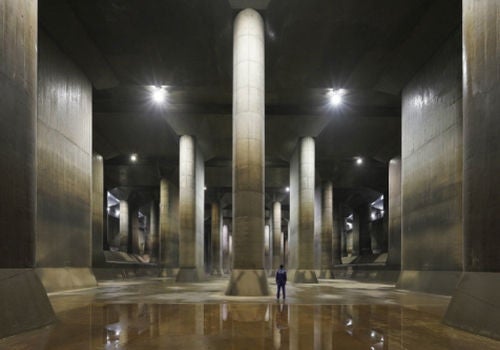 地下約50m、全長6.3Kmにおよぶ世界最大級の地下放水路、5つの河川から巨大な立坑に取り込まれた水は、調圧水槽(地下神殿)を通って、荏原の巨大な4台のポンプの力で江戸川に排水します。