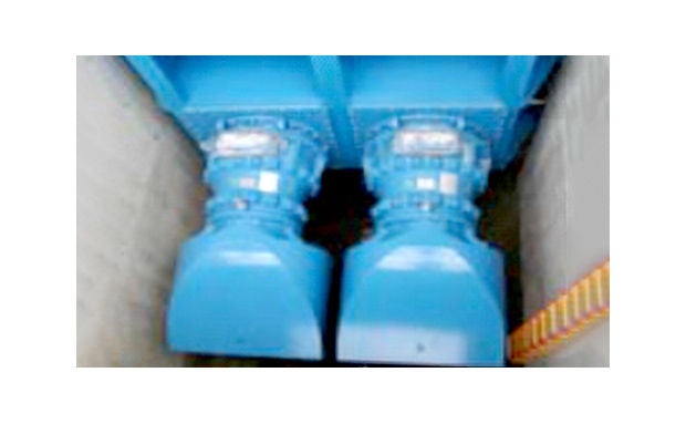 ゲート扉体に取り付けたポンプです。小河川や水路内に設置する小規模排水ポンプ設備になります。