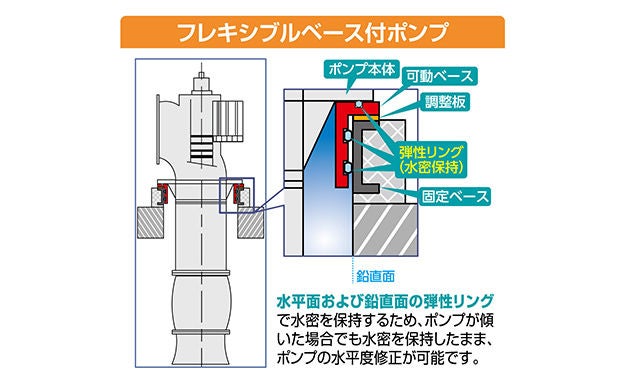 水平面と鉛直面の2つの弾性リングで水密を保持するため、水密を保持したままポンプの水平度修正が可能です。