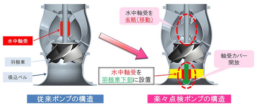 従来の立軸ポンプは、水中部にある軸受の点検や交換を行うため、期間と費用をかけてポンプを引き上げ、分解する必要がありました。楽々点検ポンプは、ポンプを据え付けたまま水中軸受の点検・交換を可能とし、作業期間の短縮と維持管理費用の縮減を実現しました。